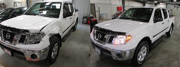 Nissan Frontier truck collision repair and vehicle painting. Front left quarterpanel was replaced along with front bumper, headlight and turn signal, hood and grille.